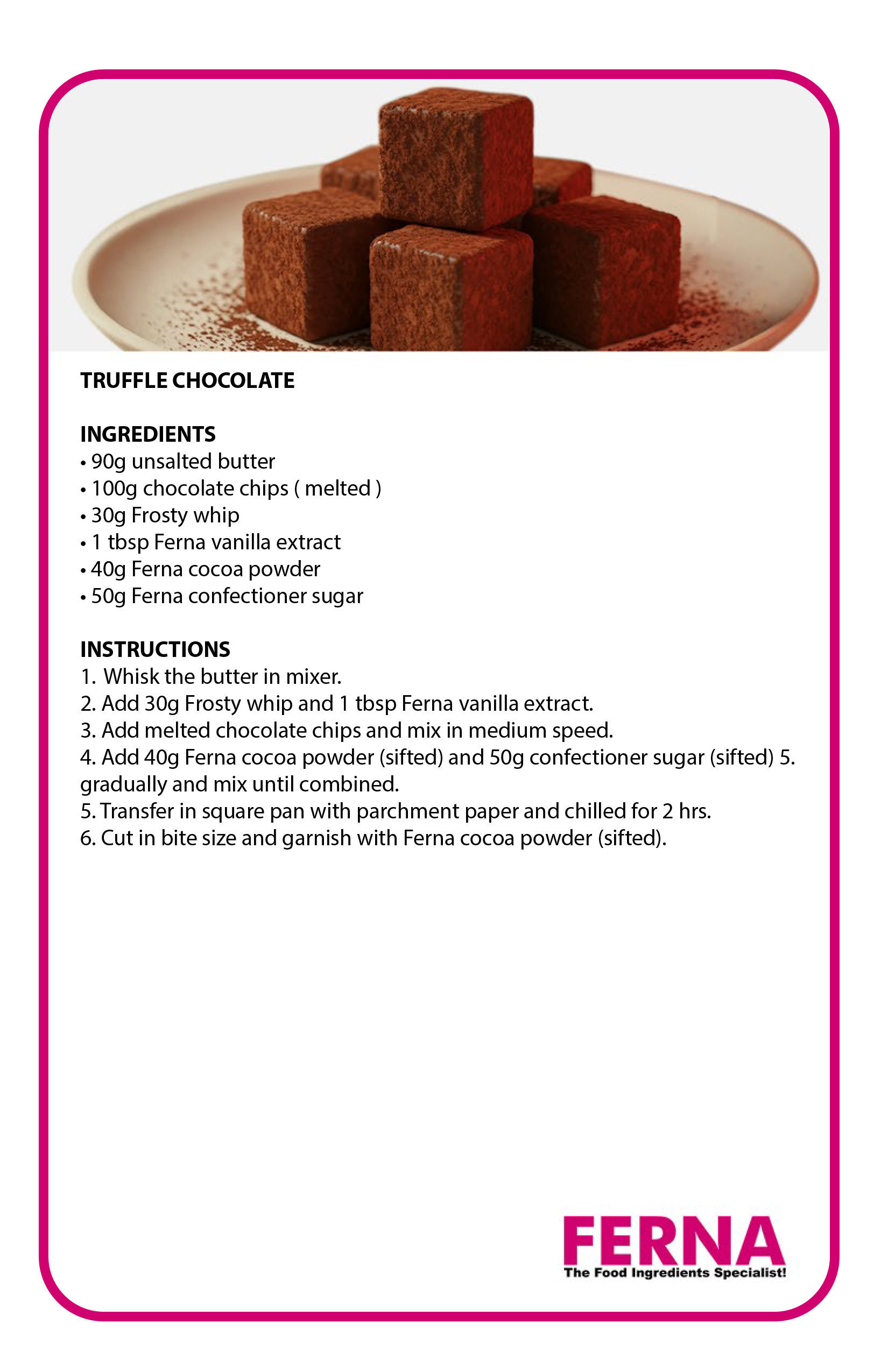 6. Cut in bite size and garnish with Ferna cocoa powder (sifted).